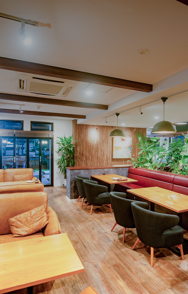 立食でもテーブル席でも自由に楽しめて、 参加者同士が気軽に話せるような、リラックスした雰囲気を作ります。